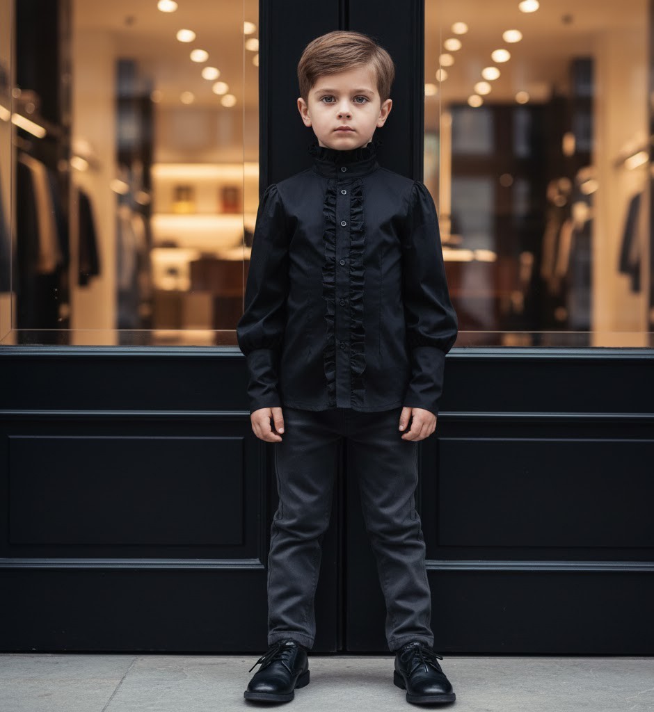 π΄οΈ Boys Black Cotton Shirt β Vintage Prince Style | Long Sleeve Dress Shirt for Kids (Ages 3β12)