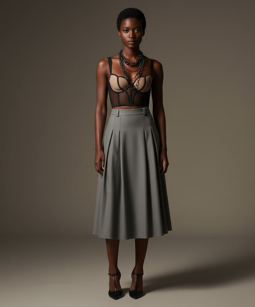 This outfit includes a corset top and a skirt. The top is stretchy and not body-limiting (the straps are detachable), so it fits sizes 6-8-10. The skirt is a UK size 8.