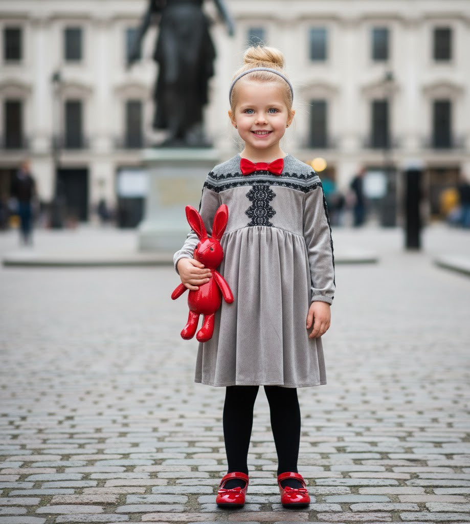Let her step out in timeless charm with this elegant grey spring dress. Crafted from a soft velvet-cotton blend and finished with vintage-inspired black lace detailing, it’s perfect for special occasions or stylish everyday wear.