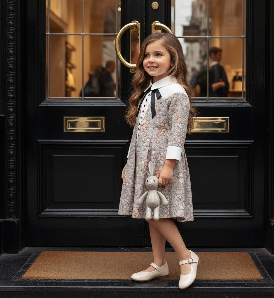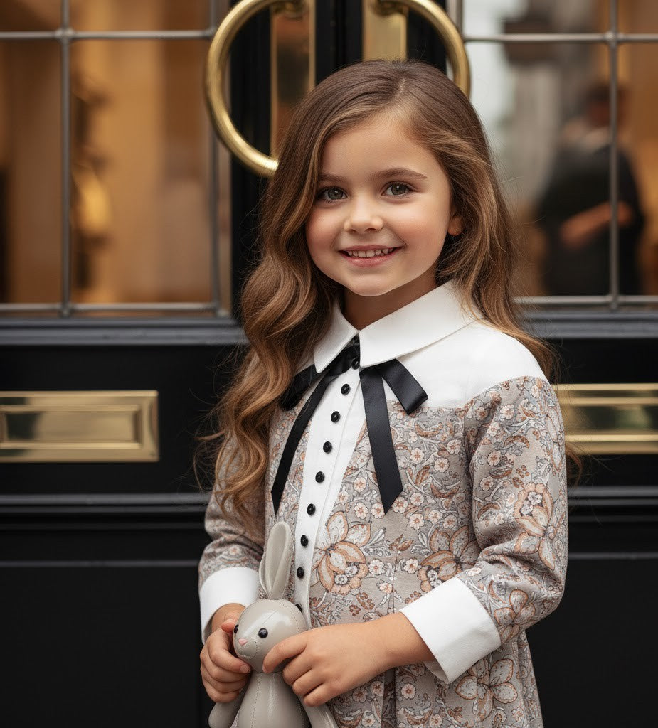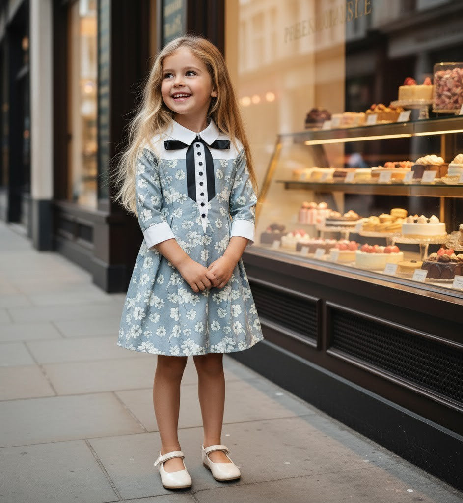 This adorable vintage-inspired girls’ dress combines elegance and charm with a playful twist. Designed with a classic doll collar, decorative bow, and delicate floral jacquard fabric, it’s perfect for special occasions or stylish everyday wear.